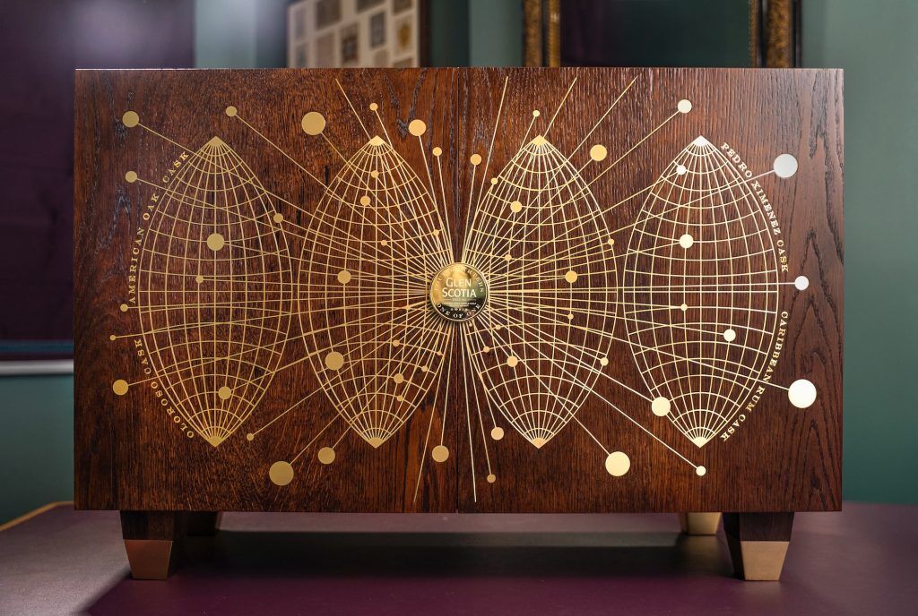 Dans le cadre d’un partenariat créatif avec le prestigieux joaillier écossais Hamilton & Inches, chacune des quatre carafes est finie à la main avec du cristal et décorée de détails plaqués or, reflétant le raffinement de la fabrication du whisky et de l’artisanat de la haute joaillerie. La collection est logée dans une armoire en chêne sur mesure, dotée d’incrustations complexes en laiton représentant les quatre quadrants du monde et d’un intérieur éclairé pour mettre en valeur les carafes dans toute leur splendeur.